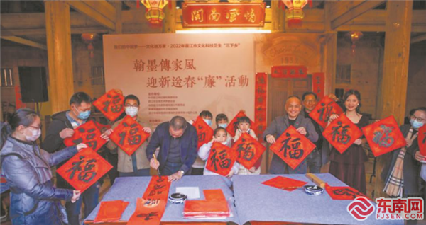 在“翰墨传家风,迎新送春‘廉’”书赠春联活动中,8名晋江市书法家不仅为街区的番仔楼和古厝书写了春联,还为现场游客书写福字和春联。