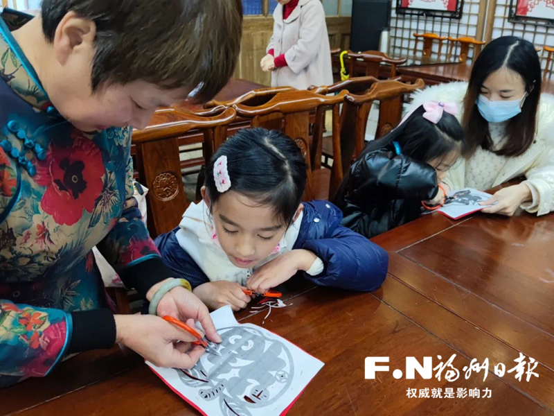孩子和家长共同体验“福”字剪纸。(福建省海峡民间艺术馆供图)