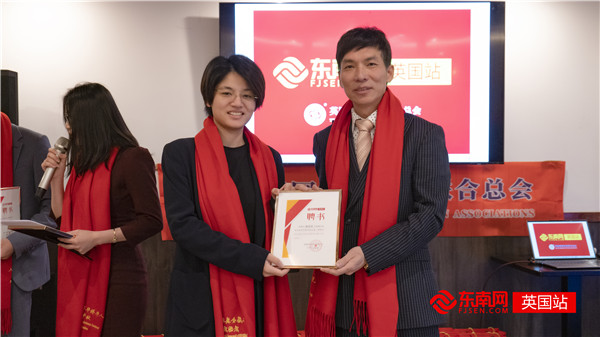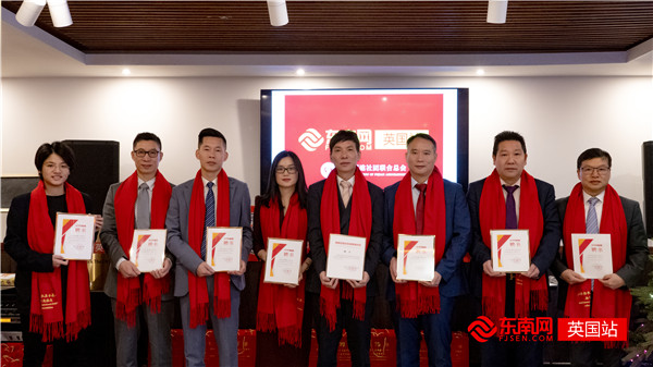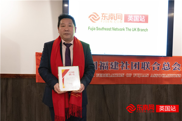 东南网英国站站长、英国福建社团联合总会主席李光喜为东南网英国站成员颁发聘书