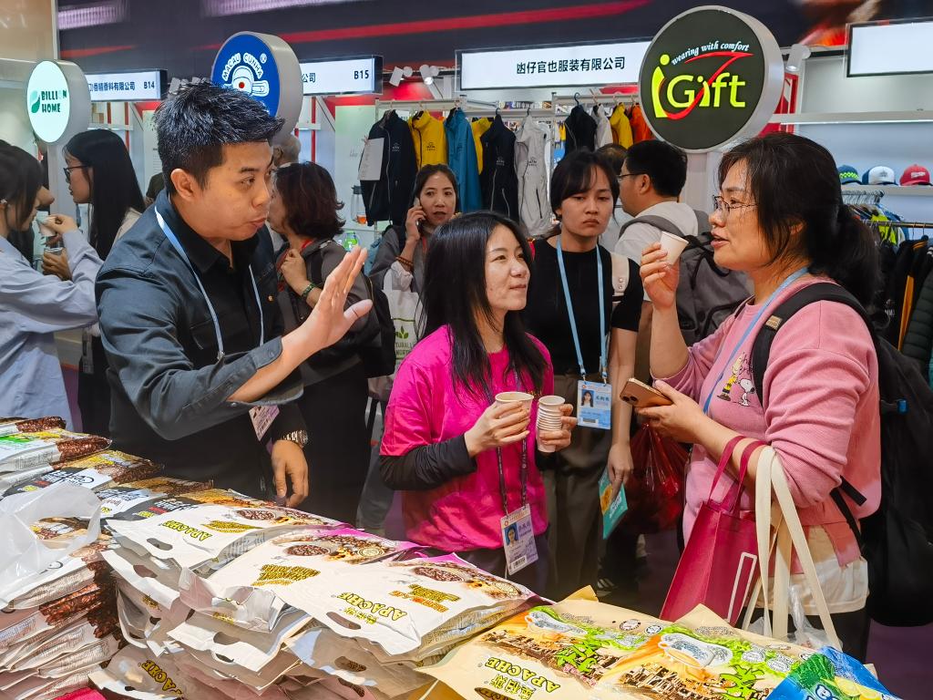 5月1日,在第135届广交会第三期现场马来西亚gpr食品私人有限公司展位,工作人员介绍曲奇饼干产品。新华社记者 洪泽华 摄