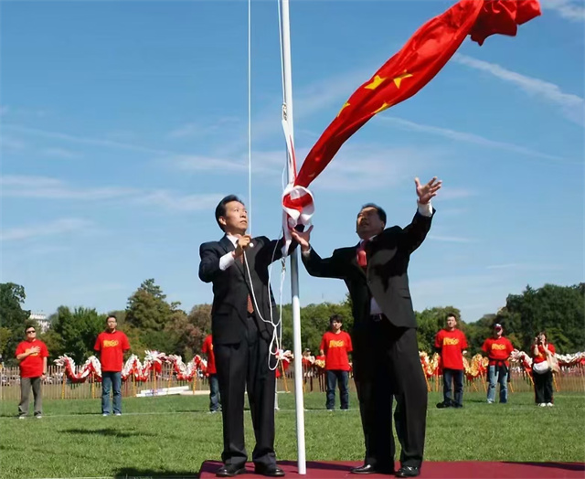 2009年9月20日,陈荣华(左)在白宫前升中国国旗。 陈荣华供图