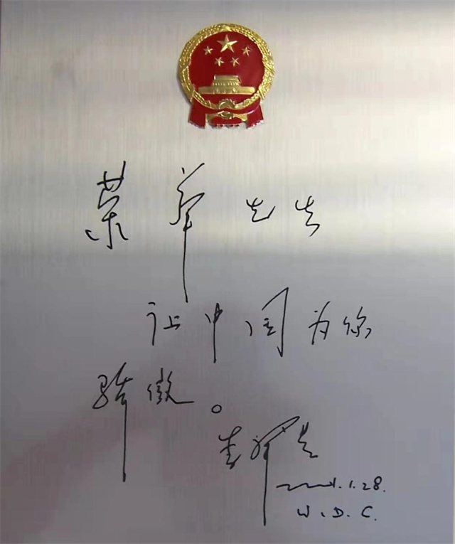 李肇星为陈荣华亲笔提词:“荣华先生,让中国为你骄傲”。陈荣华供图