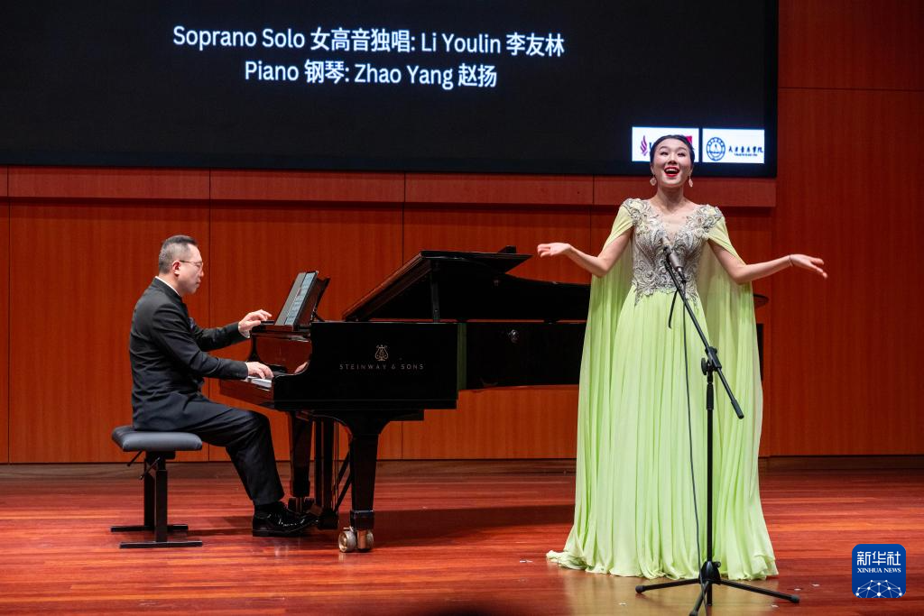 2月6日,在马来西亚吉隆坡的思特雅大学音乐厅,中国歌唱家(右)演唱马来西亚民谣《拉莎莎扬埃》。新华社发 (张纹综摄)