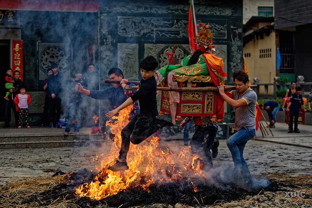 at this moment, the head of the family offers incense in the brightly lit ancestral hall, while all the male members of the family wait beside the fire pile. once the head of the family finishes the prayers and incense offering, the fire pile is lit. some of the men start setting off firecrackers, and as they jump over the fire, they scatter salt into it to keep the crackling sounds going, enhancing the festive atmosphere.