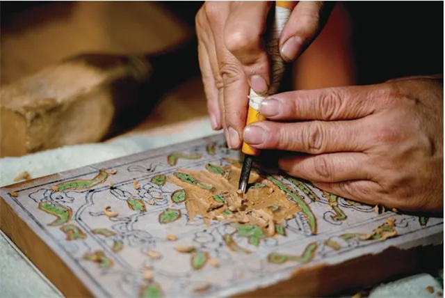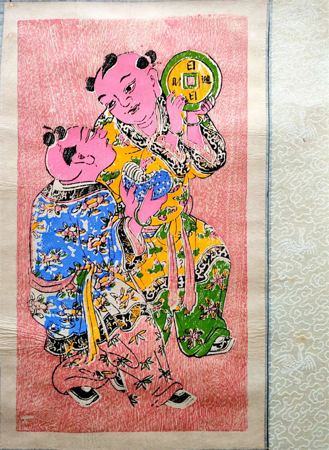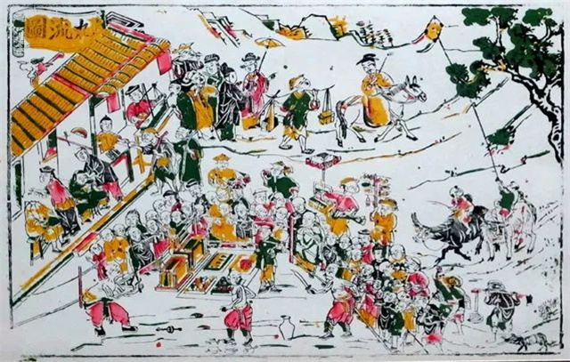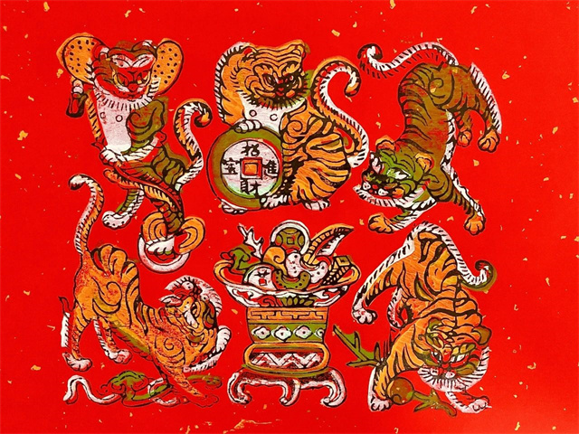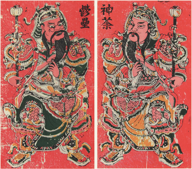 zhangzhou woodblock new year paintings originated in the song dynasty and flourished during the ming and qing dynasties, representing a unique traditional folk art form from zhangzhou, fujian. the main themes include warding off evil, praying for good fortune, historical opera stories, and decorative patterns. among zhangzhou new year paintings, door paintings are the most common, which are further categorized into "cushen (coarse deity)", "youshen (fine deity)" and other types. "cushen" refers to door paintings printed on bright red or vermilion paper, while "youshen" refers to those printed directly on natural-colored paper with light red hues manually overprinted on the figures and backgrounds.