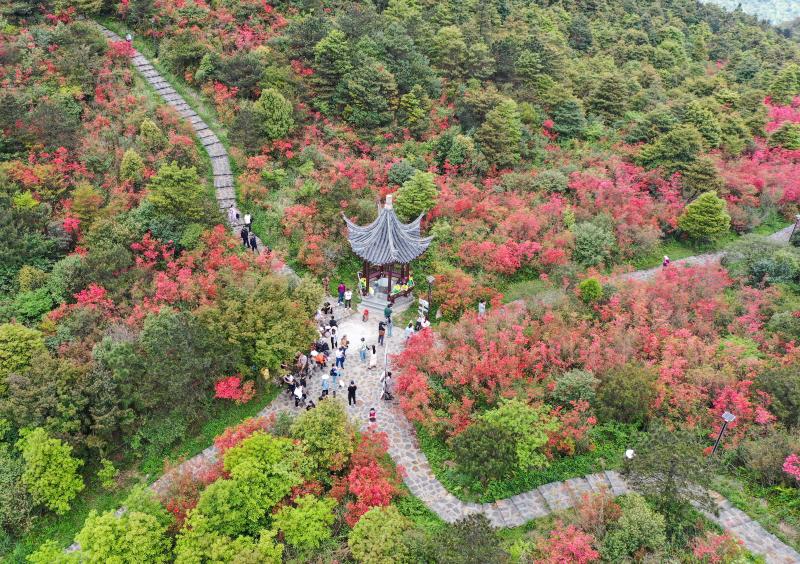in april, quanzhou's mount fo'er in anxi xianghua township reaches its most dazzling moment of the year—thousands of acres of wild azaleas burst into fiery bloom, painting the emerald mountains in vibrant crimson. perched at an altitude of over 1,000 meters and often shrouded in mist, the mountain's sweeping azalea fields intertwine with the terraced tea plantations of anxi tieguanyin, creating a uniquely southern fujian springtime panorama. standing atop the summit, visitors can gaze upon rolling seas of clouds, admire the scarlet floral tapestry up close, and savor a cup of local tieguanyin tea—immersing themselves in the romantic fujian essence where "fragrant tea mingles with boundless blossoms."