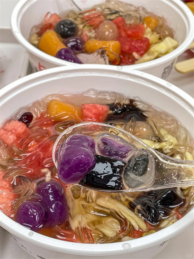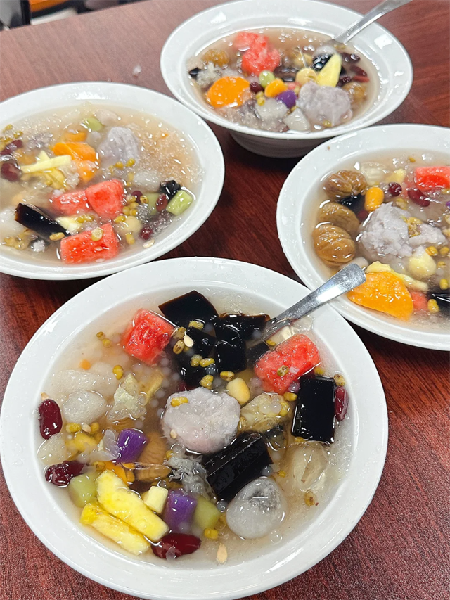 a traditional minnan dessert, siguo tang (or four fruits soup) is the taste of summer etched in fujian's collective memory. this refreshing treat starts with a base of translucent seaweed jelly, topped with seasonal fruits like watermelon, pineapple, barley, and mung beans, then drizzled with honey or syrup and finished with shaved ice—each spoonful a burst of cool sweetness.