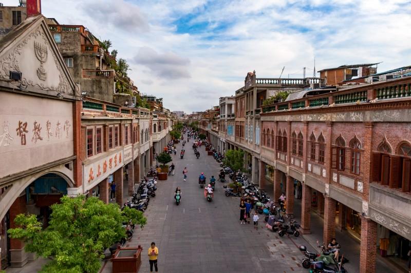 the use of red brick, a hallmark of traditional minnan architecture, in the road's qilou buildings creates a striking encounter between east and west, as well as a powerful juxtaposition of the ancient and the modern.