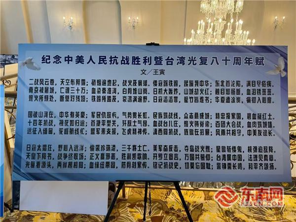 在纪念大会现场还展出了美国福建三山会馆秘书长王寅创作的“赞礼七子之歌—台湾”和“纪念中美人民抗战胜利暨台湾光复80周年赋”两篇诗作。当美国福建三山会馆秘书长郑德欣、主席助理王永应分别朗读、朗诵这两篇诗作时,现场激情澎湃,掌声如潮。