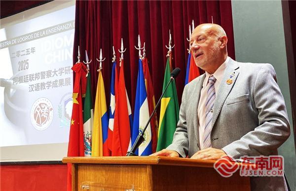 阿根廷华文教育基金会会长刘芳勇在教学成果展上发表讲话。他说:“要衷心感谢阿根廷华助中心、阿根廷联邦警察总局和联邦警察大学研究院对中文教育工作的大力支持。”刘芳勇表示,四年前中文课程在阿根廷联邦警察大学研究院设立,这个具有前瞻性的决策,为阿根廷警察队伍开启了一扇通向中华文化的大门。阿根廷对多元文化的深刻理解与包容,为学员们提供了优越的学习环境和丰富的宝贵资源,使得中文教育能够在阿根廷警察队伍中茁壮成长,让中文教育在阿根廷这片土地上生根发芽、开花结果,这也是中阿友好关系不断深化发展的生动体现,希望学员们在未来的工作和生活中,能够始终保持对中文的热爱,不断提升中文水平,成为中阿文化交流的杰出使者,为增进两国人民的深厚友谊发挥重要作用。