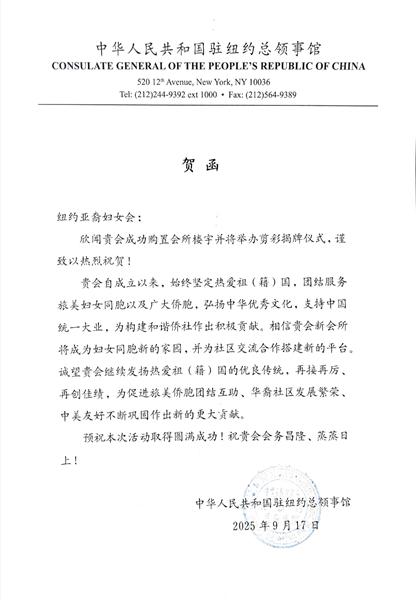 陈云代表纽约亚裔妇女会全体同仁欢迎和感谢参加活动的各位领导、社团前辈、各位来宾。陈云表示,今年是中华人民共和国成立76周年。作为海外华侨华人不仅为祖(籍)国的发展成就深感自豪,也更深切地了解和平的可贵。再过几天也将迎来中华民族传统节日——中秋节。中秋承载着每一位在海外中华儿女的家国情怀,是炎黄子孙共同的文化基因,无论身处何地,中华儿女的心都会在传统节日中紧紧相连。陈云还表示,纽约亚裔妇女会今年正式拥有了属于自己的永久会址,并完成了剪彩揭牌仪式。永久会址的建立对于纽约亚裔妇女会来说意义非凡,这代表着社区文化与女性力量的凝聚,也代表着纽约亚裔妇女会今后将以此为平台,继续服务社区,关怀女性,传承文化,团结妇女力量。