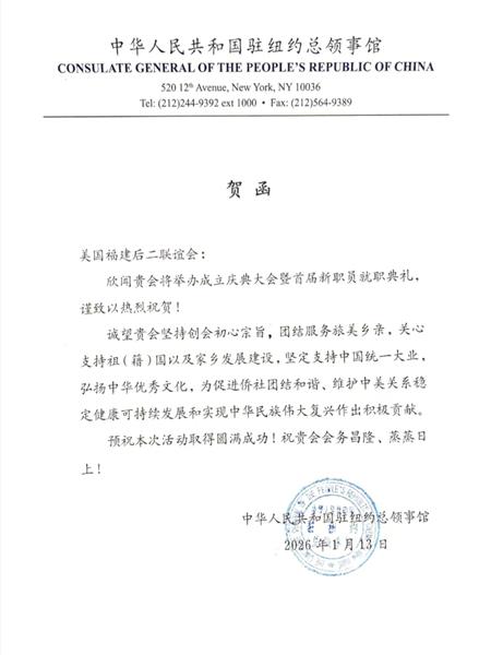 中国驻纽约总领馆,福建省连江县、琯头镇、厦门市思明区以及芜湖市、定西市、庆阳市、德阳市等有关部门单位为美国福建后二联谊会成立发来贺函。