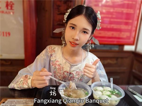来自马可·波罗故乡意大利的13岁女孩meggi,则对福州鱼丸情有独钟。她模仿“手打鱼丸”的动作,在镜头前生动讲解鱼丸的成分、制作工艺,“福州的鱼丸会跳舞!”,她开心比心说道:“我爱福州,我爱鱼丸!”