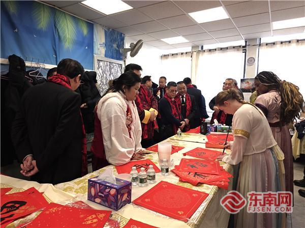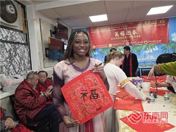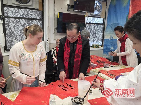 东南网2月2日讯(李景锋 王亮 特约记者 纽约墨人)红纸铺展,墨香飘溢。当地时间2月1日,纽约唐人街洋溢着浓厚的农历新年氛围。在“万福迎春·共庆新年”纽约闽籍侨团第十届挥春活动中,多位美国青年格外引人瞩目,他们手握毛笔,俯身案前,在书法家的细致指导下,兴致勃勃地临摹着汉字的结构与韵味,从握笔姿势到运笔力度,一笔一划认真书写着“福”字与春联,体验中国书法艺术的独特魅力。